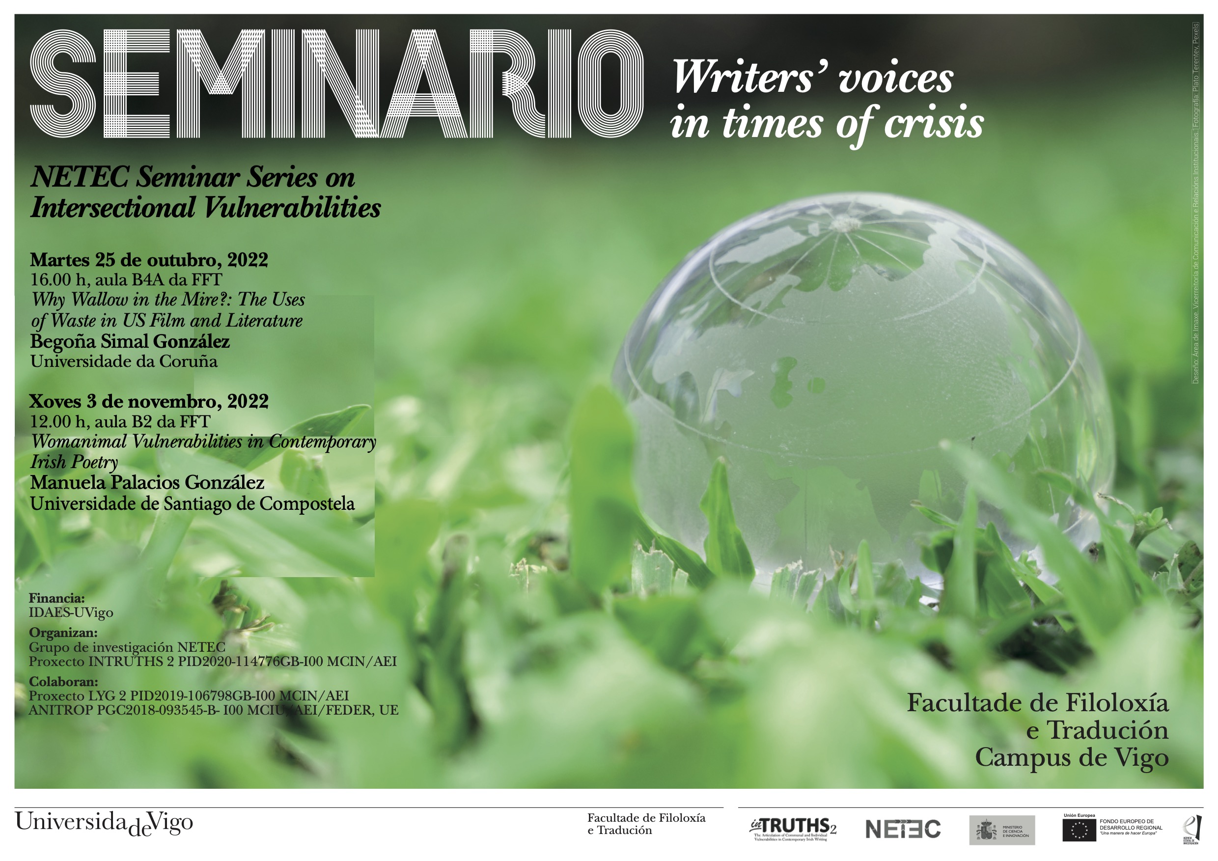 Funded by IDAES-UVigo NETEC SEMINAR SERIES ON INTERSECTIONAL VULNERABILITIES II: «WRITERS’ VOICES IN TIMES OF CRISIS» “Why Wallow in the Mire?: The Uses of Waste in US Film and Literature” Begoña Simal (Universidade da Coruña) 25 October, Tuesday:16h FFT-Room B4A “Womanimal Vulnerabilities in Contemporary Irish Poetry” Manuela Palacios González (Universidade de Santiago de Compostela) 3 November, Thursday:12h FFT-Room B2 The seminars are in-person events open to students of the PhD and MA programmes (IDAES and IMAES) co-organised by Research Group NETEC and Research Project INTRUTHS 2 PID2020-114776GB-I00 MCIN/AEI, with the collaboration of Research Projects LYG 2 PID2019-106798GB-I00 MCIN/AEI and ANITROP PGC2018-093545-B- I00 MCIU/AEI/FEDER, UE Funded by IDAES Uvigo.